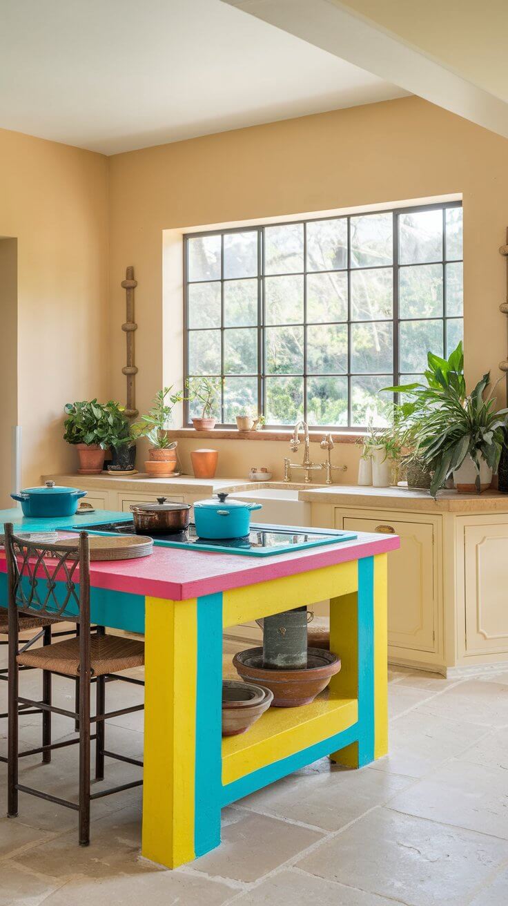 This kitchen island brings a fun twist to a classic space. With its bright yellow and turquoise hues, it adds a splash of joy to cooking and gathering. It’s a perfect way to brighten up your home and make it feel welcoming.