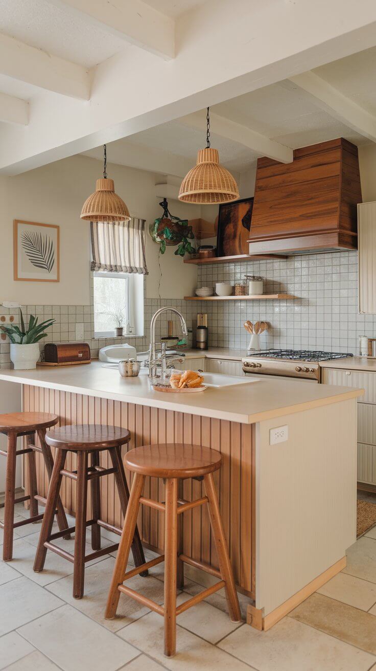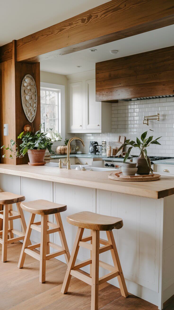 This kitchen island is the perfect spot to gather with friends and family. The simple stools invite you to sit and relax while enjoying a meal or a chat. With its light colors and warm wood accents, it feels cozy and inviting.