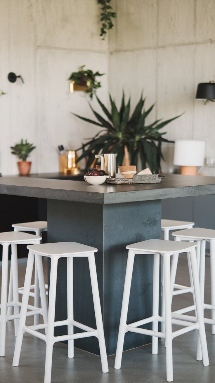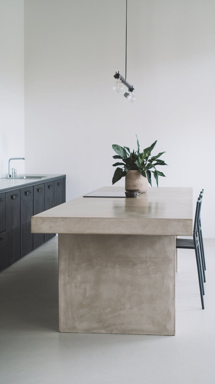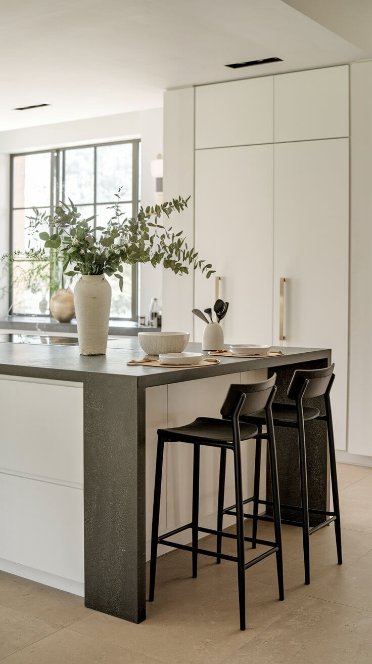 This kitchen shows off a sleek and modern concrete island that beautifully contrasts with darker cabinetry. Its clean lines and simple design create an inviting space, perfect for cooking or hanging out with friends. A touch of greenery adds warmth and character to this minimalist setup.