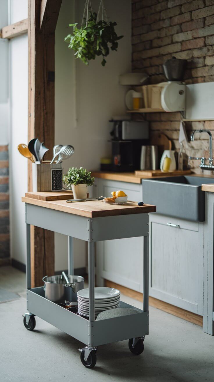 A rolling kitchen cart is a handy addition to any home. It offers extra space for cooking and serving, making meal prep a breeze. Plus, the wheels let you move it anywhere you need, adding to its charm and functionality.