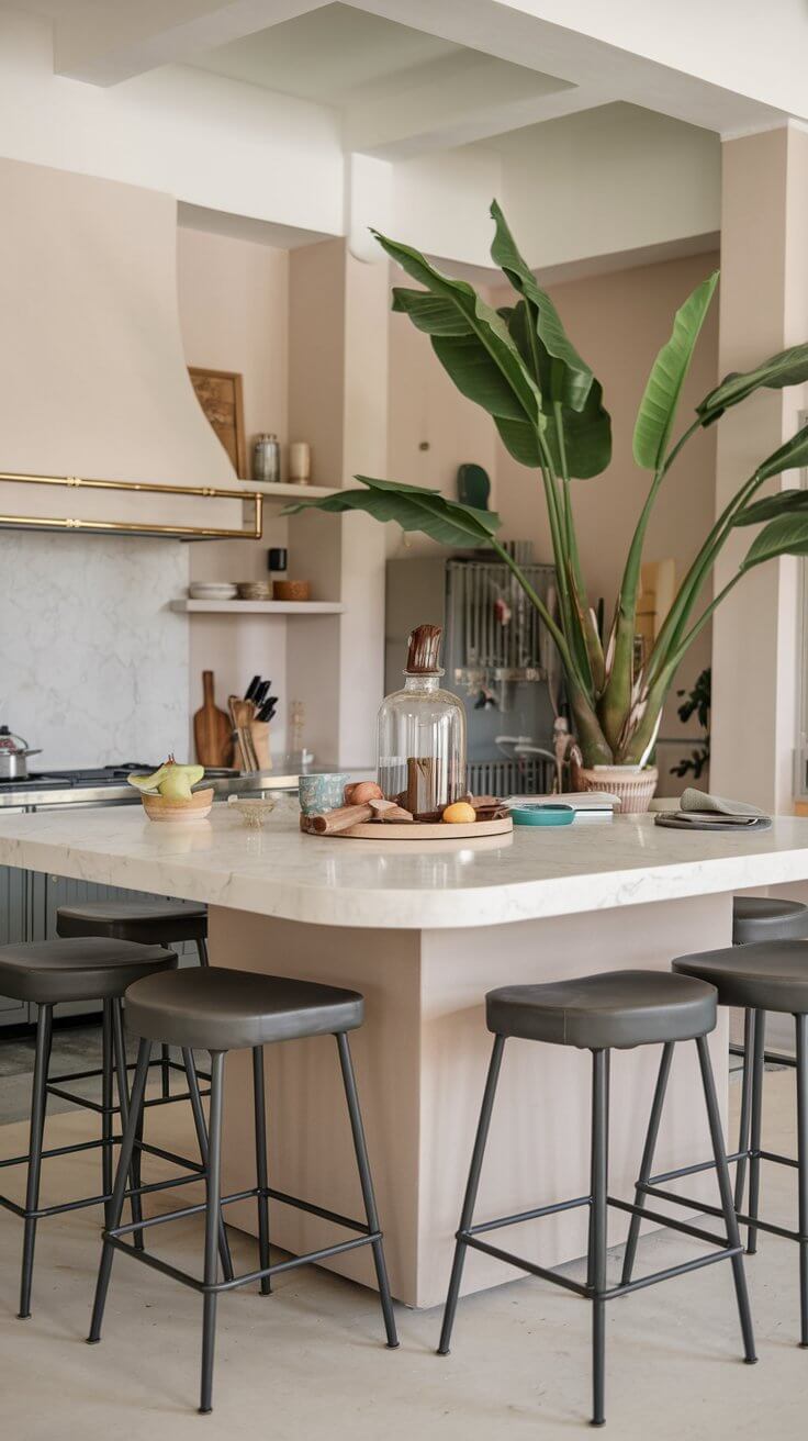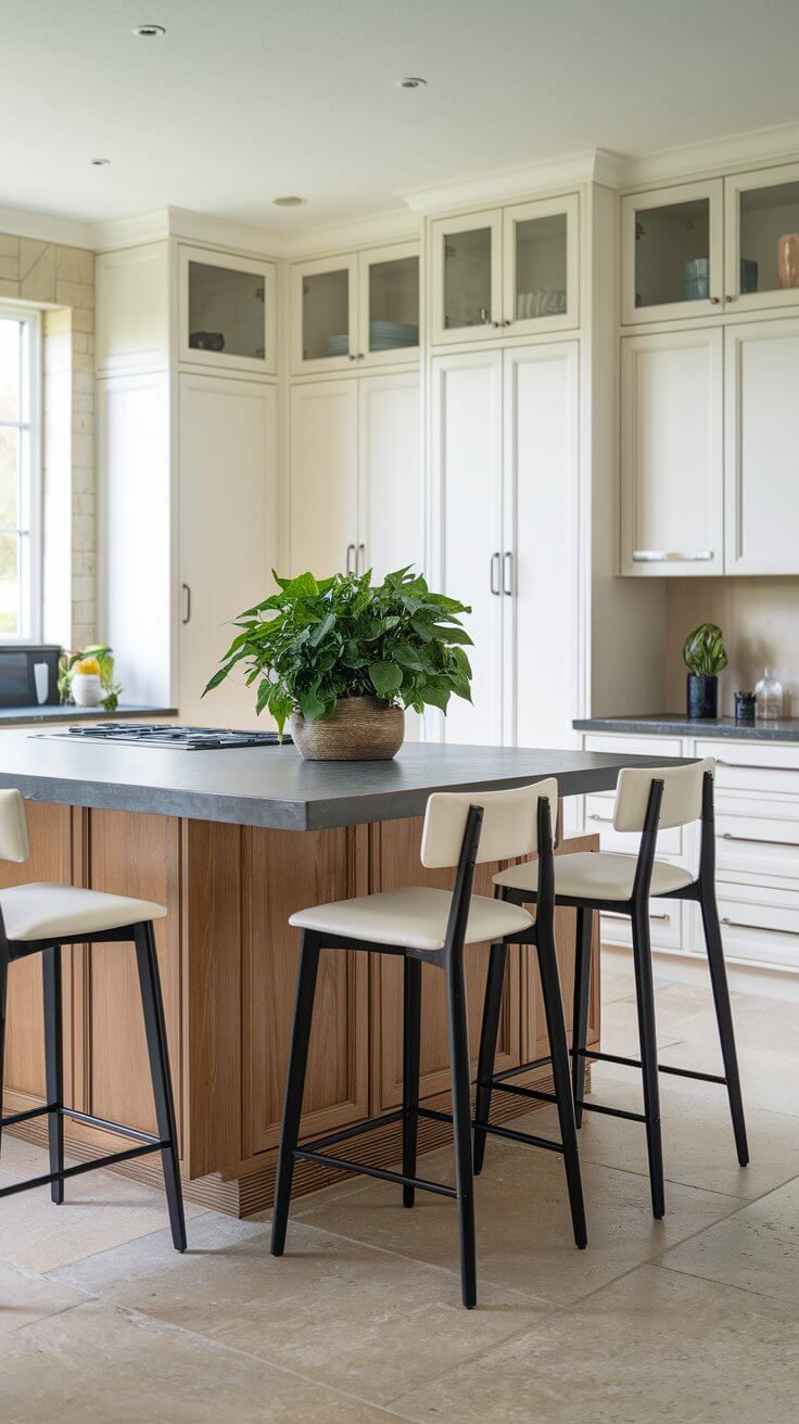 This bar-height island is a great spot for casual meals and chats. The sleek design and soft colors create a cozy vibe. Plus, those stylish stools invite you to sit down and relax!