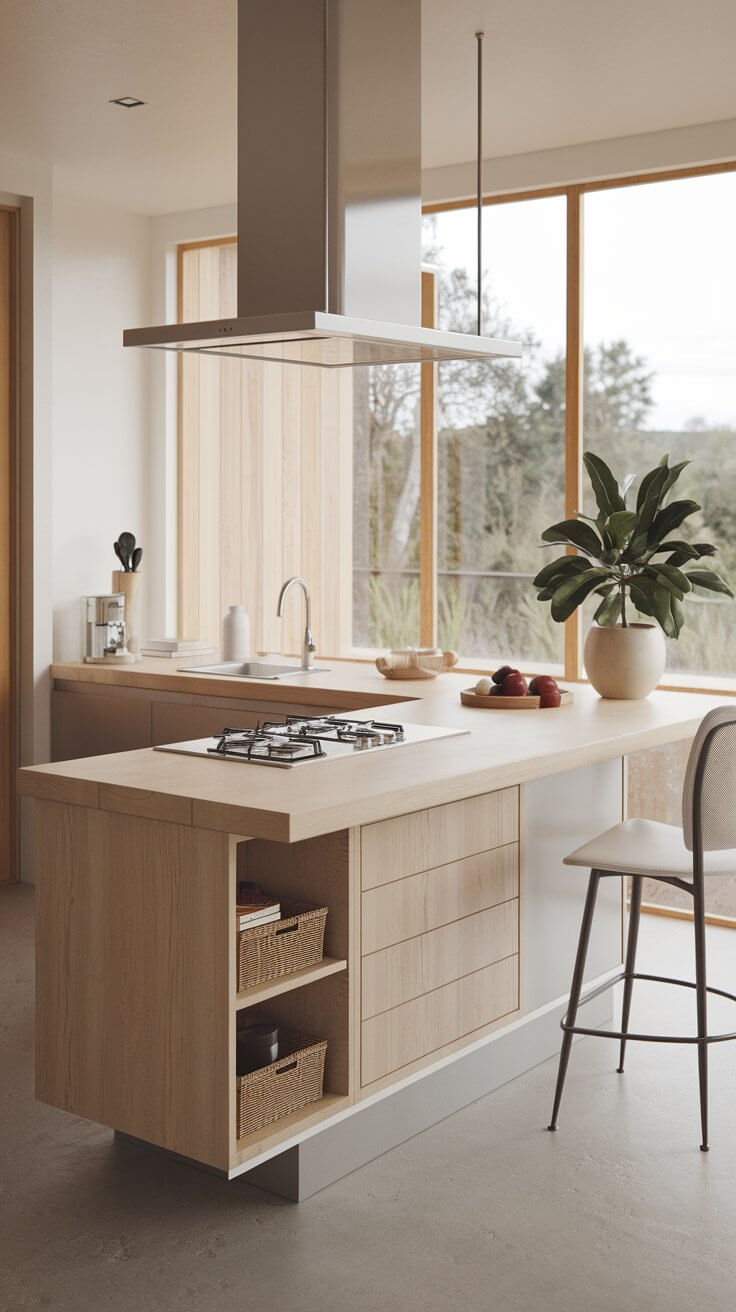 This floating island kitchen design is all about simplicity and style. The clean lines and soft colors create a warm and inviting space. It’s perfect for both cooking and socializing with friends and family.